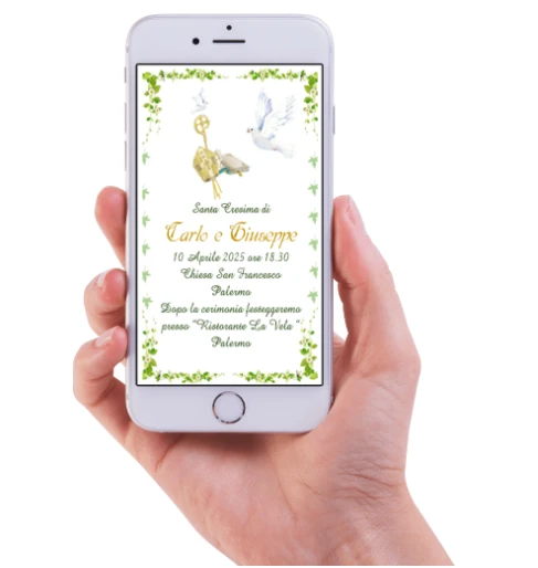 Invito Digitale Santa Cresima. L'invito è in formato digitale e vi verrà trasmesso tramite wp, vi sarà trasmessa la bozza e poi dopo l'approvazione vi verrà trasmesso il definitivo in jpeg. Il testo può essere personalizzato e trasmesso in qualsiasi lingua su richiesta.