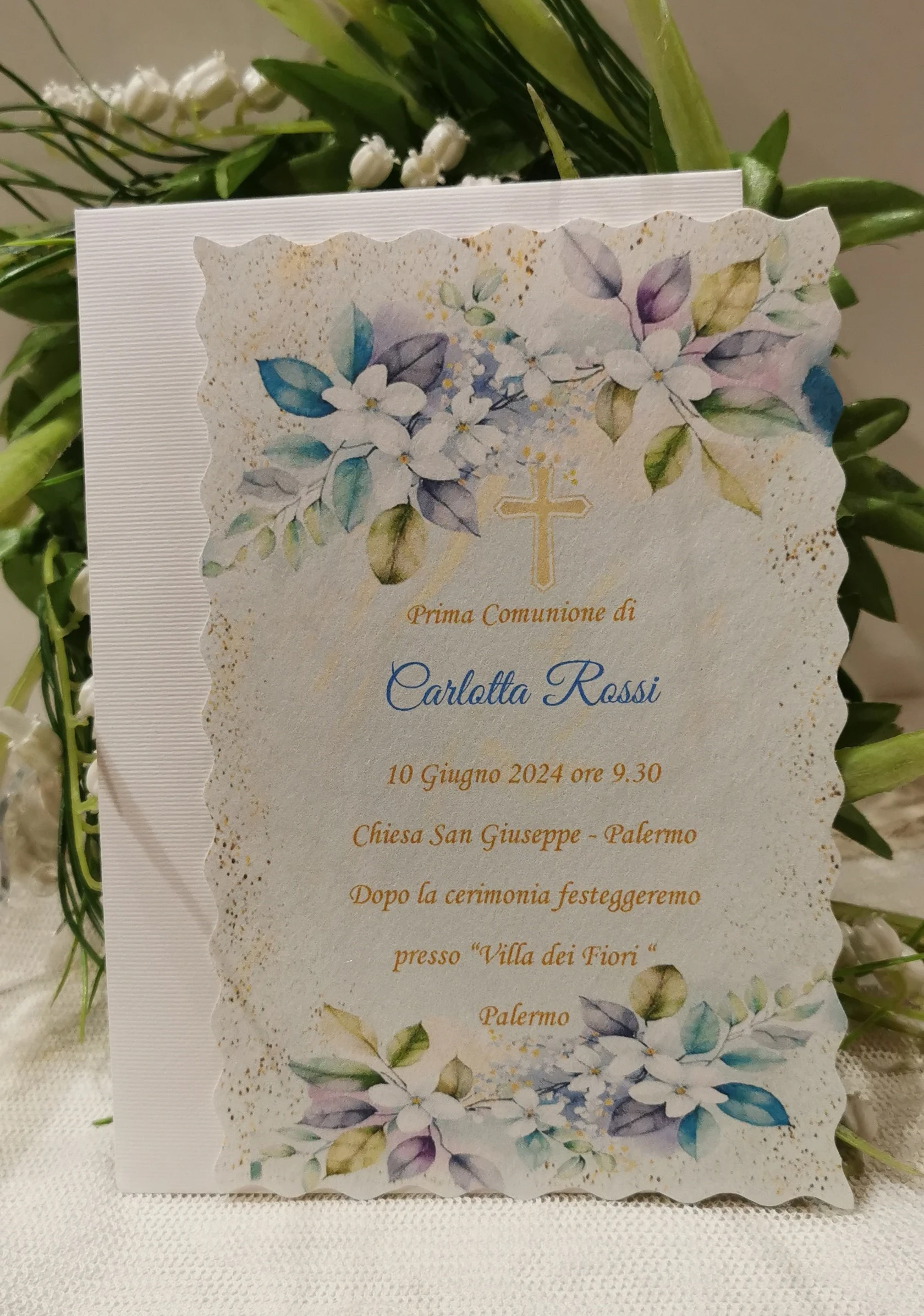 Invito prima comunione, è realizzato in cartoncino pregiato misura 12x18 completo di busta l'invito è coordinabile con segnalibro, Menù, Segnagusto, Cono, Segnaposto ecc.. I nostri inviti sono inediti . Dopo l'ordine vi verrà trasmessa bozza gratis è dopo l'approvazione andrà in stampa. La spedizione avviene con corriere tracciabile. per qualsiasi chiarimento non esitate a contattarmi tramite wp al numero 3277669580.