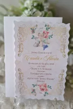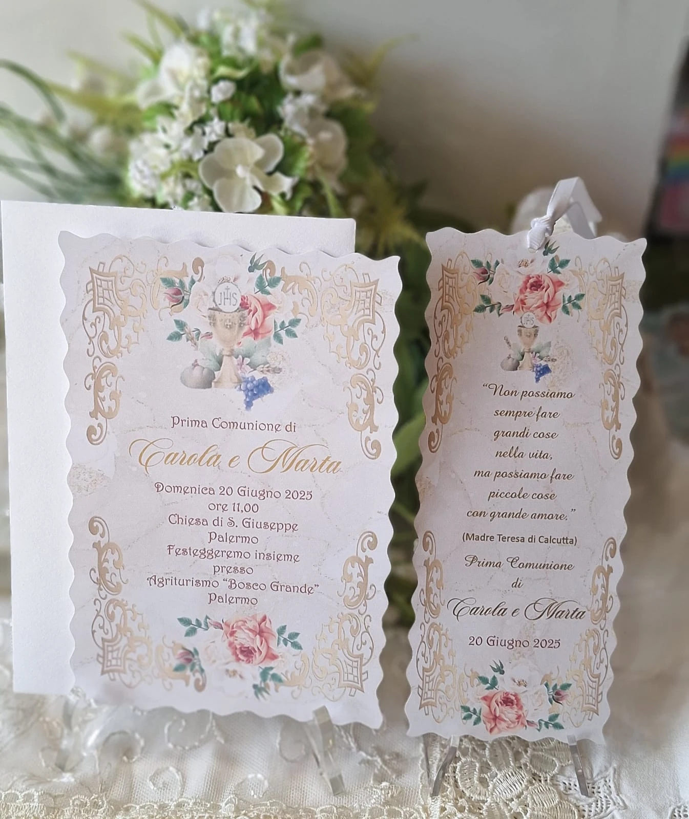 Invito prima comunione, è realizzato in cartoncino pregiato misura 12x18 completo di busta l'invito è coordinabile con segnalibro, Menù, Segnagusto, Cono, Segnaposto ecc.. I nostri inviti sono inediti . Dopo l'ordine vi verrà trasmessa bozza gratis è dopo l'approvazione andrà in stampa. La spedizione avviene con corriere tracciabile. per qualsiasi chiarimento non esitate a contattarmi tramite wp al numero 3277669580.
