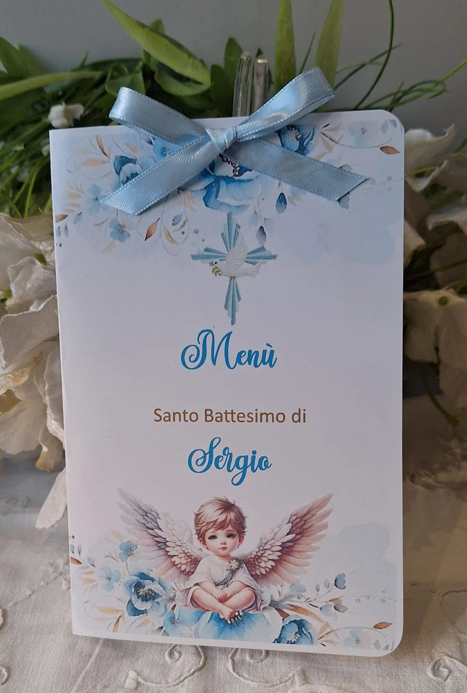 Invito Santo Battesimo, è realizzato in cartoncino pregiato misura 12x18 completo di busta l'invito è coordinabile con segnalibro, Menù, Segnagusto, Cono, Segnaposto ecc.. I nostri inviti sono inediti . Dopo l'ordine vi verrà trasmessa bozza gratis è dopo l'approvazione andrà in stampa. La spedizione avviene con corriere tracciabile. per qualsiasi chiarimento non esitate a contattarmi tramite wp al numero 3277669580.
